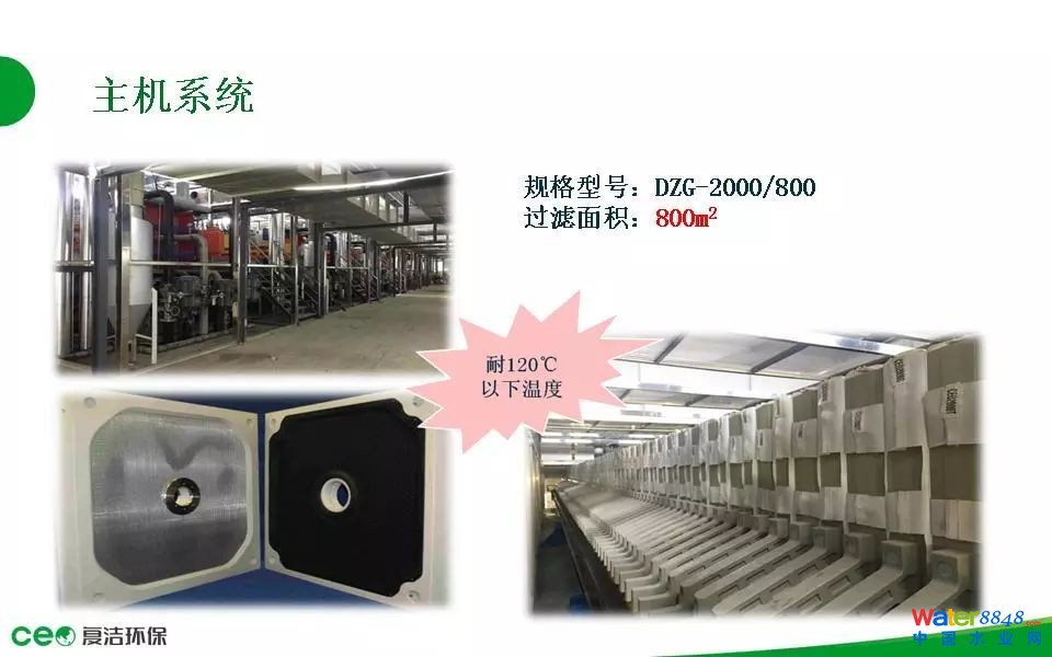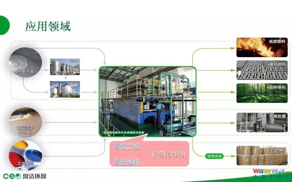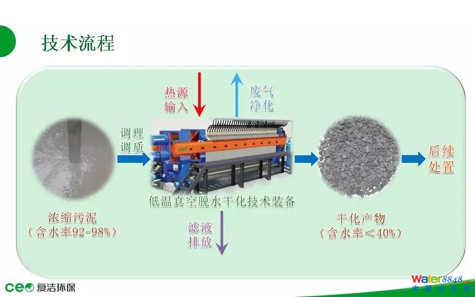 基于現(xiàn)狀,我們?cè)?/span>2008年的時(shí)候把脫水和干化能不能結(jié)合在一套工藝當(dāng)中完成?作為我們當(dāng)時(shí)技術(shù)的理念,開發(fā)出了低溫真空脫水干化成套技術(shù)裝備,把污泥的脫水和干化在一套工藝設(shè)備中連續(xù)完成。在這工藝中,我們從濃縮污泥開始,含水率一般為90%99%左右,這樣的污泥通過調(diào)理調(diào)質(zhì),進(jìn)入我們有點(diǎn)類似于板框壓濾機(jī)的設(shè)備,同時(shí)輸入熱源,因?yàn)楦苫隙ㄊ切枰獰嵩吹摹M瑫r(shí)排放出濾液,還有一些廢氣的排放,最終產(chǎn)出了含水率40%以下的干化產(chǎn)物。我們結(jié)合項(xiàng)目本身的性質(zhì),比如工業(yè)上危廢污泥干化要求比較高,通常做到20%以下,化工產(chǎn)品當(dāng)中我們做到干化后含水率2%以下。