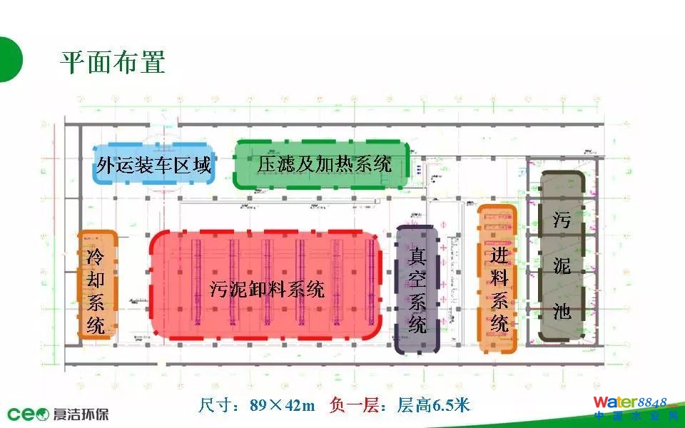平面布置這塊,我們系統(tǒng)設(shè)備地下有一部分,地面上有一部分,地面層整個(gè)占地89×42米,層高10.9米,主要有主機(jī)部分,污泥濃縮,包括除臭,還有調(diào)質(zhì)以及整個(gè)控制間。這是底下層,也就是負(fù)一層,占地尺寸是一樣的,底下標(biāo)高稍微矮一點(diǎn),大約6.5米。這里面主要包括污泥的卸料系統(tǒng),還有壓濾加熱系統(tǒng),這是我們重點(diǎn)區(qū)域的一些功能。我們整個(gè)項(xiàng)目當(dāng)中采用的BIM做的設(shè)計(jì),因?yàn)檫@個(gè)項(xiàng)目是地下結(jié)構(gòu),很多設(shè)計(jì)包括施工必須要前期考慮的更多,否則后續(xù)的土建和管道沒法進(jìn)行變更的,所以當(dāng)時(shí)進(jìn)行了大量的BIM模型設(shè)計(jì)。