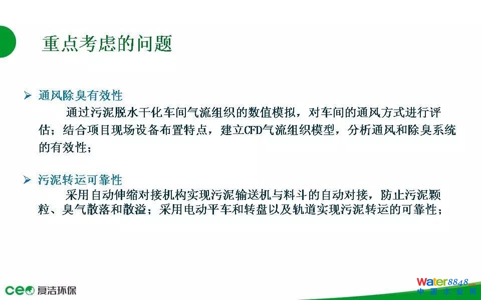 針對(duì)地下式污水處理廠重點(diǎn)考慮的問題主要有兩點(diǎn),第一重點(diǎn)是通風(fēng)除臭的有效性,通過污泥脫水干化車間氣流組織的數(shù)值模擬,對(duì)車間的通風(fēng)方式進(jìn)行評(píng)估,根據(jù)項(xiàng)目現(xiàn)場(chǎng)設(shè)備布置特點(diǎn),建立CFD氣流組織模型,分析通風(fēng)和除臭系統(tǒng)的有效性。從目前調(diào)試運(yùn)行的情況來看,效果相當(dāng)理想。第二重點(diǎn)是考慮污泥怎么從地下能夠轉(zhuǎn)運(yùn)到地面上,污泥的轉(zhuǎn)運(yùn)可靠性也是我們重點(diǎn)考慮的。這過程中我們采用了全封閉,自動(dòng)伸縮對(duì)接機(jī)構(gòu),必須考慮對(duì)接的有效性,同時(shí)防止污泥,包括臭氣有逸散的情況。因?yàn)榈叵驴臻g有限,必須用電動(dòng)平車和轉(zhuǎn)盤以及軌道實(shí)現(xiàn)污泥轉(zhuǎn)運(yùn)的可靠性。目前這個(gè)系統(tǒng)還在調(diào)試過程,污泥量有限,所以還未進(jìn)行連續(xù)的測(cè)試。