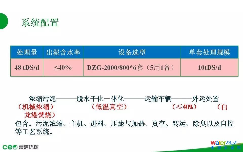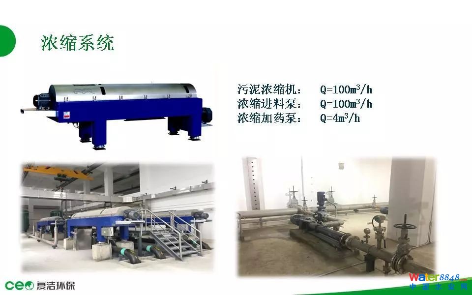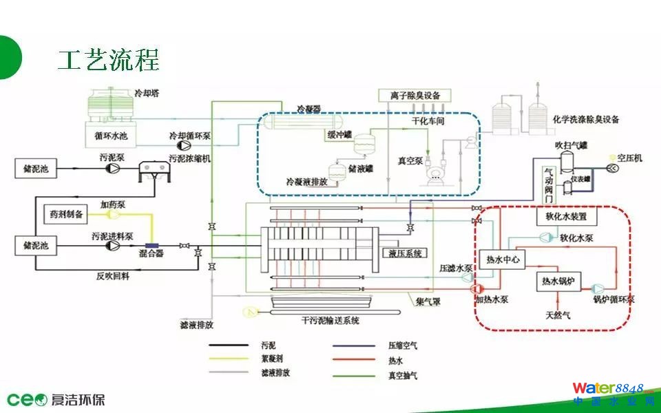 這是他們整個(gè)廠的污水處理的流程,我們主要處理的污泥來源一個(gè)是剩余污泥,還有高效沉淀以后的物化污泥,這兩個(gè)污泥直接到污泥儲(chǔ)池,含水率在99.2%左右。整個(gè)干基泥量是48噸,從機(jī)械濃縮開始,經(jīng)過脫水干化一體化的工藝,最后40%的污泥要運(yùn)到白龍港進(jìn)行焚燒,整套系統(tǒng)包括了濃縮、主機(jī)、進(jìn)料、壓濾加熱、真空、轉(zhuǎn)運(yùn)、除臭,以及自控等工藝系統(tǒng)。