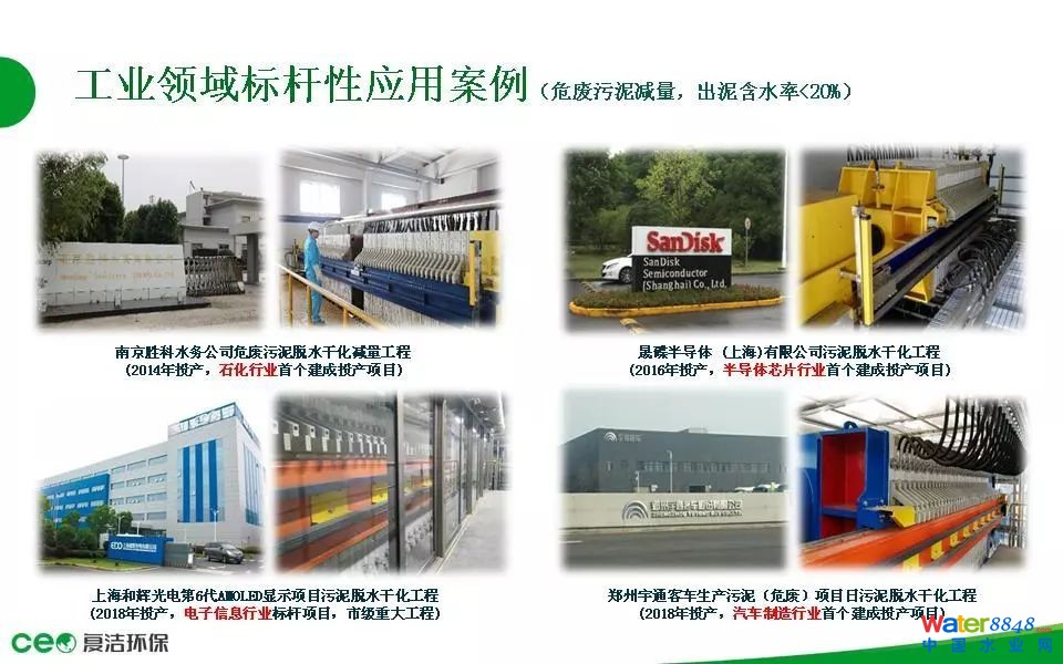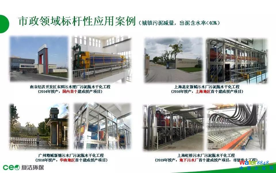 最后再看一下幾個(gè)市政領(lǐng)域標(biāo)桿性的應(yīng)用案例,第一個(gè)項(xiàng)目應(yīng)用在2014年,南京首個(gè)投產(chǎn)的市政項(xiàng)目;2016年在上海首個(gè)投產(chǎn)的污泥脫水干化項(xiàng)目;這個(gè)是我們?cè)谌A南地區(qū)廣州首個(gè)建成投產(chǎn)的項(xiàng)目;這是我們2019年虹橋地下式污水處理廠項(xiàng)目。
