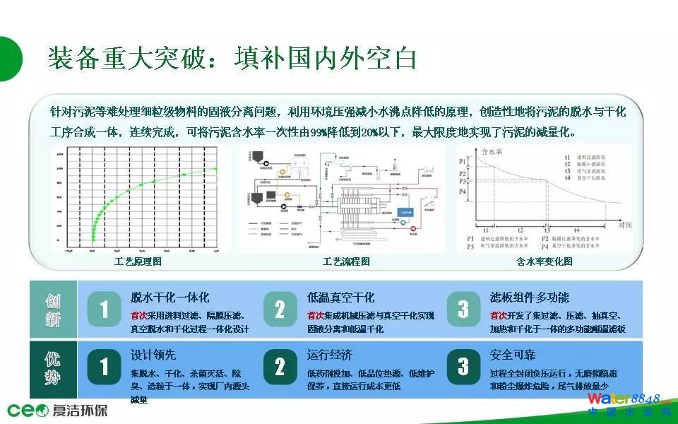 針對(duì)技術(shù)本身,我們實(shí)現(xiàn)了重大突破,填補(bǔ)了國(guó)內(nèi)外污泥脫水干化領(lǐng)域技術(shù)的空白。設(shè)備本身主要還是針對(duì)處理細(xì)粒級(jí)物料的固液分離,利用環(huán)境壓強(qiáng)減小水沸點(diǎn)降低的原理,創(chuàng)造性地將污泥的脫水與干化工序合成一體,連續(xù)完成,將污泥含水率一次性由99%降低到20%以下,最大限度地實(shí)現(xiàn)了污泥的減量化。我們有幾個(gè)創(chuàng)新,脫水干化一體化,首次采用進(jìn)料過濾、隔膜壓濾、真空脫水和干化過程一體化設(shè)計(jì)。第二個(gè)是首次集成機(jī)械壓濾與真空干化,實(shí)現(xiàn)固液分離和低溫干化,第三個(gè)是首次開發(fā)成功了集過濾、壓濾、抽真空加熱和干化于一體的多功能耐溫濾板。我們總結(jié)出自己的優(yōu)勢(shì),第一,集脫水、干化、殺菌滅活、除臭、造粒于一體,實(shí)現(xiàn)廠內(nèi)源頭減量,第二,低藥劑投加、低品位熱源、低維護(hù)成本,直接運(yùn)行成本更低;第三,過程全封閉負(fù)壓運(yùn)行,無磨損隱患和粉塵爆炸危險(xiǎn),尾氣排放量少。在很多污泥干化行業(yè)都會(huì)碰到的問題,在我們工藝當(dāng)中得到了很有效的規(guī)避。
