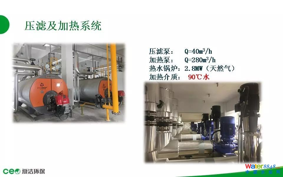 這個(gè)系統(tǒng)濃縮部分用的是離心機(jī),把污泥的含固率提高到4-5%左右。這是我們的主機(jī)部分,總共有6臺(tái)設(shè)備,這些濾板能夠耐120度以下的高溫,也是我們真正進(jìn)入脫水和干化的關(guān)鍵環(huán)節(jié)。這是進(jìn)料泵和加藥泵,加藥量為干基的千分之11.5,這是我們配的壓濾泵和加熱泵以及常壓熱水鍋爐,加熱的介質(zhì)為90度的熱水。這是真空泵,主要是使系統(tǒng)內(nèi)部形成負(fù)壓,然后把出來的氣水混合物混合物抽出來。