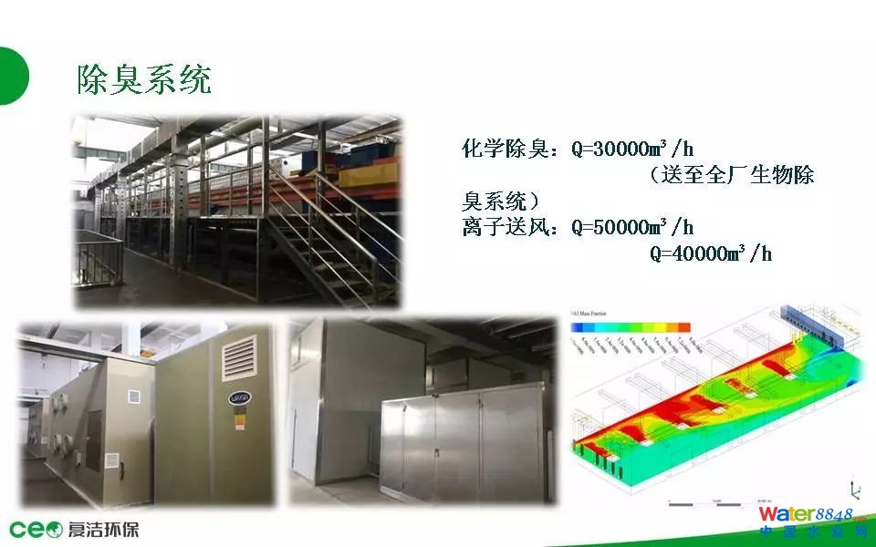 這是除臭系統(tǒng),我們最后的臭氣進(jìn)入整廠的生物除臭,我們就地采取的是化學(xué)除臭。另外我們對(duì)空間的操作環(huán)境進(jìn)行離子送風(fēng)除臭,這當(dāng)中進(jìn)行了大量的氣流組織模擬的工作。