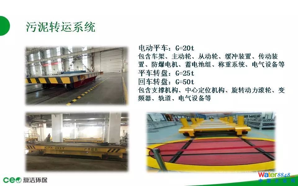 電動(dòng)平車,這是污泥轉(zhuǎn)運(yùn)系統(tǒng)的一部分,因?yàn)槭堑叵陆Y(jié)構(gòu),車輛包括各方面的運(yùn)輸,包括走的道路都是受限制的,在這個(gè)項(xiàng)目當(dāng)中我們是采用了電動(dòng)平車,包括了平車轉(zhuǎn)盤和回車轉(zhuǎn)盤,使我們每個(gè)設(shè)備底下的料斗和外運(yùn)的車能夠很有效地進(jìn)行銜接,經(jīng)過了我們大量的測(cè)試工作,證明是安全可靠的。