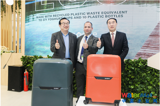 環(huán)博會(huì)開幕首日,蘇伊士展臺(tái)上人頭攢動(dòng),新秀麗集團(tuán)大中華區(qū)總裁馬瑞國(guó)、利安德巴賽爾中國(guó)合資企業(yè)管理及聚烯烴業(yè)務(wù)副總裁付立民、蘇伊士亞洲地區(qū)固廢資源管理固廢基建及新服務(wù)業(yè)務(wù)總監(jiān)古山(Francois JENNY)主持揭幕儀式,攜手推出由回收塑料制成的可持續(xù)發(fā)展系列旅行箱,展示了三方共同致力于減少碳足跡,賦予塑料廢棄物第二次生命,減少原始材料的使用的愿景。借此機(jī)會(huì),古山先生還向現(xiàn)場(chǎng)來(lái)賓介紹了“蘇伊士可持續(xù)固廢管理方案”,分享新形勢(shì)下固廢資源的源頭管理、過(guò)程追溯、合理處置利用及減碳排放貢獻(xiàn)的重要性。