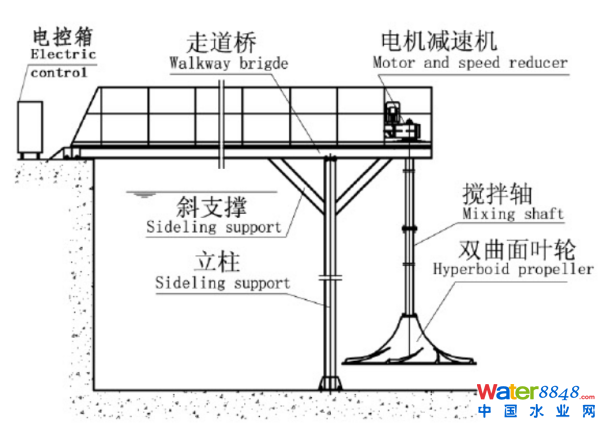 圖一為干式安裝,通過橋架將減速電機(jī)定位在水池上方,由傳動軸將動力傳遞給水下的雙曲面葉輪,傳動軸的長度根據(jù)池深而定,一般葉輪離池底約300mm。