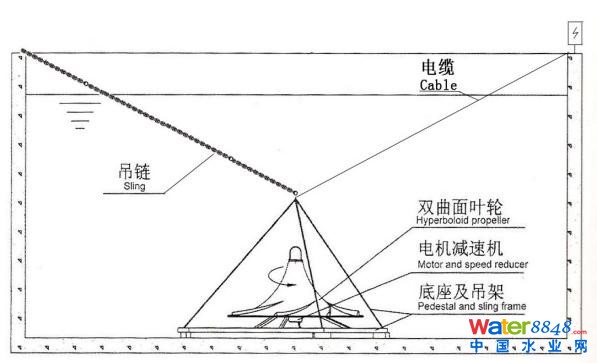 圖二為潛水式安裝,它由潛水電機(jī)、雙曲面葉輪和吊裝附件組成。利用潛水電機(jī)依靠設(shè)備自重定位,無需額外固定設(shè)施。