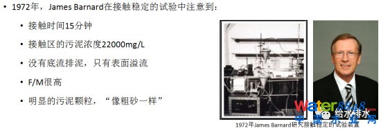 現(xiàn)在談?wù)劥蠹冶容^關(guān)注多的好氧顆粒污泥技術(shù),實(shí)際上在活性污泥工藝發(fā)展的歷史中有人就觀察到了顆粒污泥的現(xiàn)象。比如70年代的時(shí)候James Barnard在接觸穩(wěn)定的試驗(yàn)中注意到,接觸區(qū)的污泥濃度只有22000mg/L,接觸時(shí)間15分鐘,沒(méi)有底流排泥,Barnard觀察到了明顯的顆粒污泥現(xiàn)象,像“粗砂”一樣。