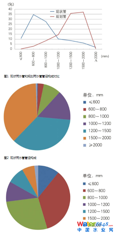 圖1  現(xiàn)狀雨水管和規(guī)劃雨水管管徑構(gòu)成對(duì)比