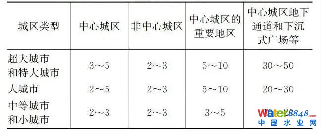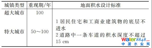 中共中央關(guān)于制定國(guó)民經(jīng)濟(jì)和社會(huì)發(fā)展第十四個(gè)五年規(guī)劃和2035年遠(yuǎn)景目標(biāo)的建議中明確:“加強(qiáng)城鎮(zhèn)老舊小區(qū)改造和社區(qū)建設(shè),增強(qiáng)城市防洪排澇能力,建設(shè)海綿城市、韌性城市” 。即將發(fā)布《城鄉(xiāng)排水工程項(xiàng)目規(guī)范》明確了城市雨水管渠設(shè)計(jì)重現(xiàn)期標(biāo)準(zhǔn)和內(nèi)澇防治重現(xiàn)期標(biāo)準(zhǔn),見表1和表2。