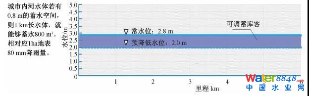 實(shí)際上,城市水體有兩個(gè)功能,一是旱天景觀生態(tài),二是雨天蓄水儲(chǔ)水,見圖8所示。習(xí)近平總書記給城市黑臭水體整治確定的目標(biāo)是:“清水綠岸,魚翔淺底” 明確了城市水體要避免高水位,大水面。旱天“淺”水,就為雨天蓄水、儲(chǔ)水創(chuàng)造了條件,見圖9。這個(gè)“淺”字可是有科學(xué)內(nèi)涵的,是實(shí)現(xiàn)城市水體恢復(fù)生態(tài)的前提條件,需要勇氣去創(chuàng)造。