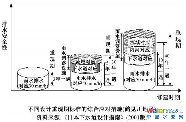 城市內(nèi)澇的根本原因是“因洪致澇”,也就是說當(dāng)流域發(fā)生洪水時(shí),城市外圍的江河湖水體就會(huì)出現(xiàn)高水位、大水量、甚至高潮位,這就會(huì)導(dǎo)致城市內(nèi)河也會(huì)高水位。在這個(gè)時(shí)候,城市排水口將被淹沒,導(dǎo)致排水不暢,甚至要退出運(yùn)行,此時(shí)內(nèi)澇不可避免,“因洪致澇”由此而生。解決內(nèi)澇之患必須流域統(tǒng)籌、與水利統(tǒng)籌,這就是發(fā)揮藍(lán)色設(shè)施的重要作用。日本《下水道指南》中有一張非常形象的示意圖,詳見圖7。其清晰地解釋的城市排水系統(tǒng)與藍(lán)色措施共同應(yīng)對(duì)內(nèi)澇的關(guān)系。要提高城市排水安全,減少內(nèi)澇風(fēng)險(xiǎn),藍(lán)色措施是必不可少的。當(dāng)然這里還要求多部門、多地區(qū)的流域聯(lián)合和聯(lián)動(dòng)。