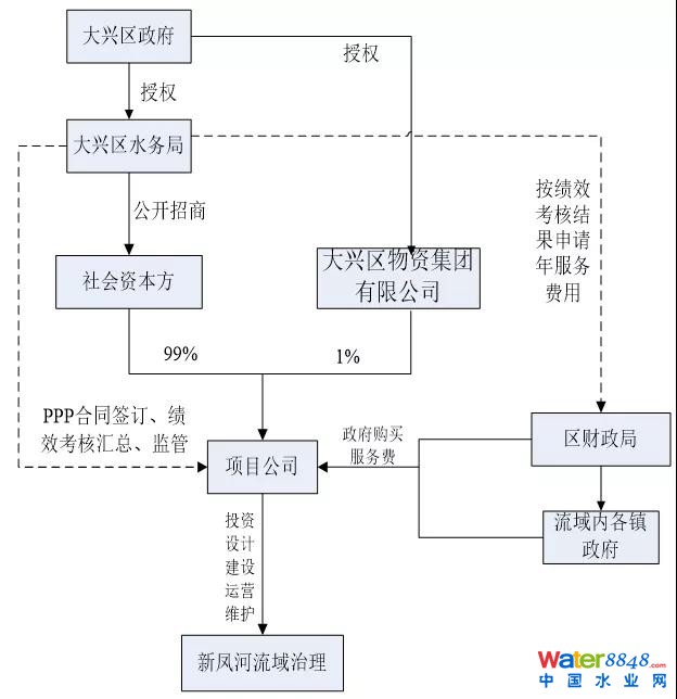2)大興區(qū)物資集團(tuán)有限公司與中標(biāo)的社會(huì)資本(北控水務(wù))簽署《合資經(jīng)營(yíng)合同》,在大興區(qū)成立項(xiàng)目公司(北京北控興鳳水環(huán)境治理有限公司),在項(xiàng)目公司中,大興區(qū)物資集團(tuán)占1%股份,北控水務(wù)占99%股份。