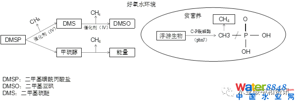 有悖于傳統(tǒng)觀念中厭氧底泥CH4釋放,這種在好氧環(huán)境下CH4過量釋放的現(xiàn)象被學(xué)界稱之為“甲烷悖論”,其產(chǎn)生機理如下圖所示。以藻類代謝物二甲基磺酰丙酸鹽(DMSP)及其降解產(chǎn)物甲硫醇、二甲基硫醚(DMS)、二甲基亞砜(DMSO)等作為底物,在有氧環(huán)境下可以產(chǎn)生CH4的“假說”已被證實。另外一項最新研究稱,一種微生物酶可讓甲基磷酸脂(MPn)在脫去磷酸酯分子過程中生成CH4,這也為解釋地表水體甲烷悖論現(xiàn)象提供了理論根據(jù)。