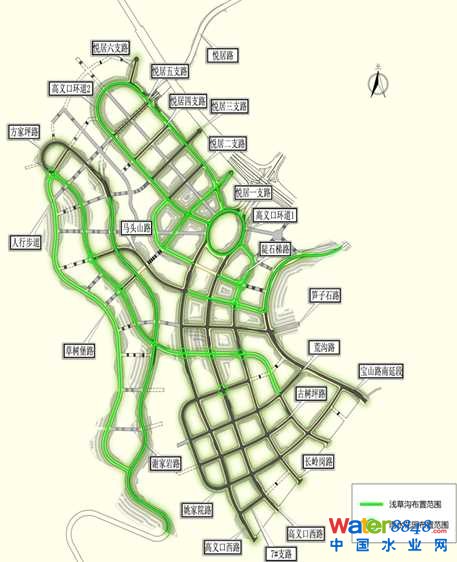 基于LID(Low Impact Design)的設(shè)計理念,將雨水作為一種資源,采用生態(tài)工程方法將道路紅線范圍內(nèi)的雨水徑流匯集進入淺草溝或持水花園進行綜合處置;地塊內(nèi)雨水應通過地塊開發(fā)建設(shè)中配套實施的雨水綜合利用設(shè)施進行綜合利用。
