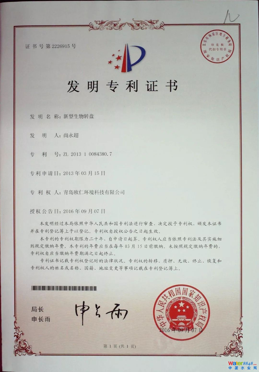 農(nóng)村污水生物轉(zhuǎn)盤技術(shù)創(chuàng)新獎(jiǎng)