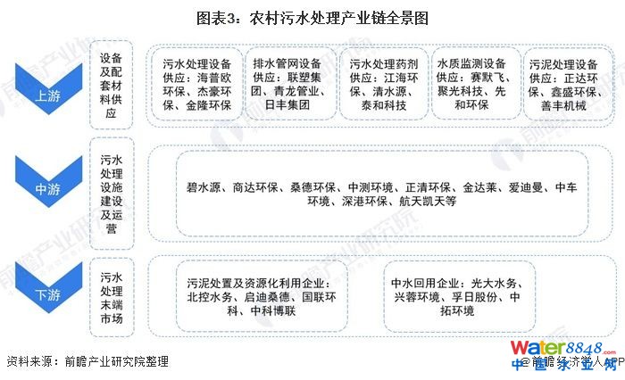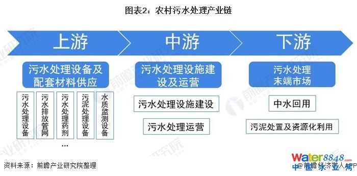 農(nóng)村污水處理行業(yè)上游供應(yīng)商一般為污水處理設(shè)備及配套材料供應(yīng);中游主要是農(nóng)村污水處理設(shè)施建設(shè),以及農(nóng)村污水處理設(shè)施建設(shè)后的運(yùn)營(yíng)、管理、監(jiān)督、維護(hù)以及其他管理性質(zhì)工作,如污水處理設(shè)施的服務(wù)外包,多種形式的委托經(jīng)營(yíng)等;下游為污水處理末端市場(chǎng),如中水回用、污泥處置及資源化利用等。