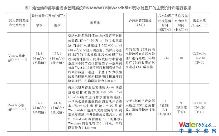 維也納和蘇黎世的污水管網(wǎng)系統(tǒng)覆蓋97%以上市區(qū),均以合流制為主。維也納主污水處理廠(VMWWTP)和蘇黎世Werdhölzli 污水處理廠分別是奧地利和瑞士最大的污水處理廠。表1給出了兩座城市各自污水管網(wǎng)和污水處理廠的主要設(shè)計和運行參數(shù)。維也納和蘇黎世兩個污水管網(wǎng)的外來水約為各自污水管網(wǎng)內(nèi)污水量的36%和48%(見表2),合流制管網(wǎng)溢流(CSO)化學(xué)需氧量(COD)負荷約為各自污水負荷的7%和3%。維也納污水干管的坡度為0.4%。在旱季高峰水量運行時,截流干管內(nèi)污水流速可達1 m/s,防止污水中固體在管網(wǎng)內(nèi)輸送過程中的沉積。