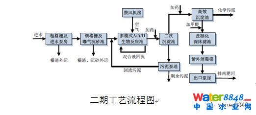 小倉(cāng)房廠整體設(shè)計(jì)規(guī)模達(dá)20萬(wàn)噸/日,其中一、二期項(xiàng)目設(shè)計(jì)規(guī)模均為10萬(wàn)噸/日,一期提標(biāo)和二期新建項(xiàng)目出水執(zhí)行優(yōu)于一級(jí)AGB18918-2002)的類Ⅳ類地表水標(biāo)準(zhǔn)。
