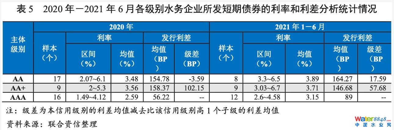2019年至2021年6月,除AA級別水務企業(yè)債券發(fā)行利率波動上升外,其他級別水務企業(yè)所發(fā)行不同期限債券利率均波動下降。2020年,水務企業(yè)短期債券的平均發(fā)行利率為3.16%,較上年的3.80%大幅下降。2021年1-6月,水務企業(yè)短期債券平均發(fā)行利率(3.53%)較2020年有所上升,且較上年同期平均發(fā)行利率(2.97%)也有所上升。