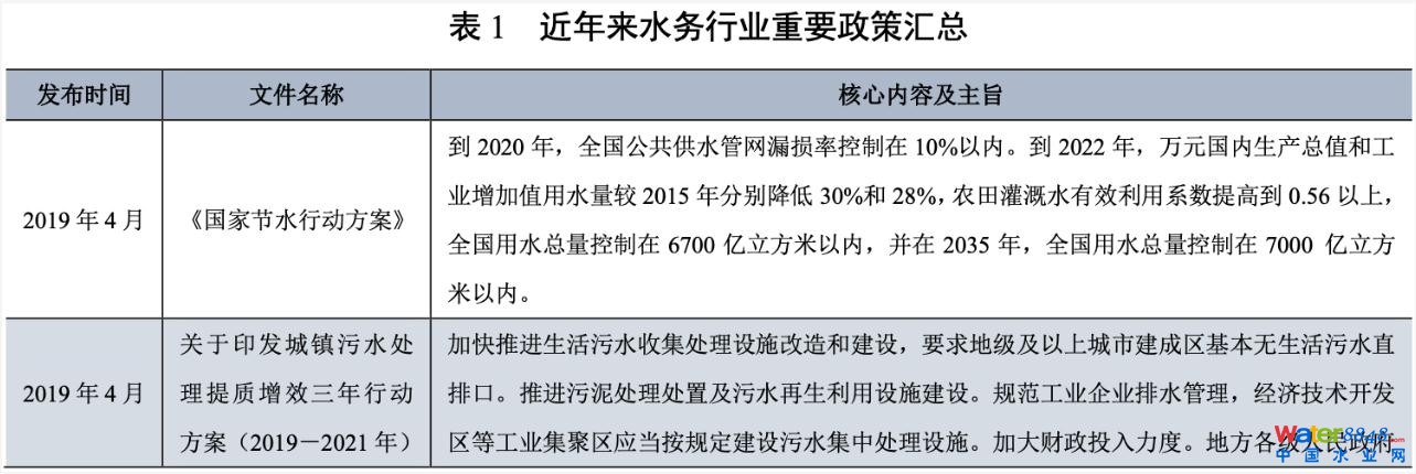 國家發(fā)改委、水利部等多部委新出臺水務行業(yè)相關(guān)文件,主要通過以下三個方面確保水務行業(yè)健康、可持續(xù)發(fā)展。(一)要求實施嚴格的節(jié)約用水制度,控制用水總量;在《國家節(jié)水行動方案》要求下,我國將進一步實施最嚴格的節(jié)水制度,通過降低漏損率,提高用水效率,降低單位產(chǎn)能水資源使用量,并在用水總量上進行嚴格控制。(二)加快城鎮(zhèn)污水設(shè)施建設(shè),加強污水排放監(jiān)測,進行污水處理收費標準改革。相關(guān)政策要求要加快推進生活污水收集處理設(shè)施改造和建設(shè),規(guī)范工業(yè)污水集中處理設(shè)施,監(jiān)測重點排污企業(yè)污水排放;并要求地方各級政府盡快將污水處理費收費標準調(diào)整到位,原則上應當補償污水處理和污泥處理處置設(shè)施正常運營成本并合理盈利,并綜合考慮企業(yè)和居民承受能力,完善差別化定價,統(tǒng)籌使用污水處理費與財政補貼資金,通過政府購買服務方式向水務企業(yè)支付服務費。(三)中央預算、地方財政、金融機構(gòu)和社會資本方等多方參與,解決污水處理、水利設(shè)施和生態(tài)治理等項目資金需求。政策要求,對于生態(tài)保護等重點項目,可納入中央項目儲備庫管理,加快中央預算執(zhí)行,進一步理順中央與地方收入劃分和完善轉(zhuǎn)移支付制度改革中統(tǒng)籌考慮地方環(huán)境治理的財政需求,建立健全常態(tài)化、穩(wěn)定的中央和地方環(huán)境治理財政資金投入機制。加大財政投入力度,研究探索規(guī)范項目收益權(quán)、特許經(jīng)營權(quán)等質(zhì)押融資擔保,鼓勵金融機構(gòu)為污水處理提質(zhì)增效項目提供融資支持。營造良好市場環(huán)境,吸引社會資本參與設(shè)施投資、建設(shè)和運營。通過政府和社會資本合作方式,吸引社會資本參與農(nóng)村生活污水治理。對補短板的社會民生等方面基礎(chǔ)設(shè)施項目,在投資回報機制明確、收益可靠、風險可控前提下,可適當降低資本金最低比例。