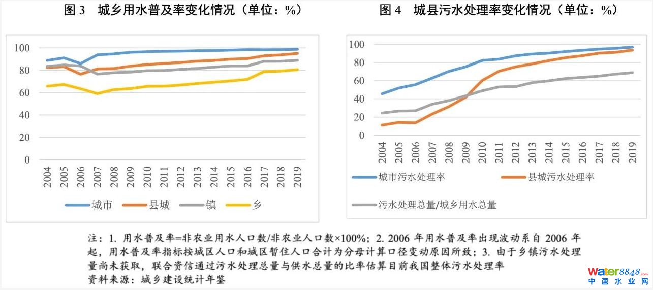 鄉(xiāng)鎮(zhèn)供水方面,2019年,我國鄉(xiāng)和建制鎮(zhèn)用水人口1.82億人,同比增長1.11%,鄉(xiāng)鎮(zhèn)年用水總量141.66億立方米,同比下降2.84%。2019年,我國鄉(xiāng)、鎮(zhèn)的用水普及率分別為80.5%和89%,較城市98.78%的用水普及率尚有差異,鄉(xiāng)鎮(zhèn)供水市場尚有一定開發(fā)空間。