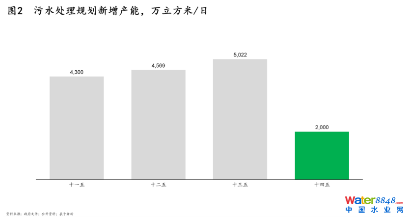 一是污水處理日漸成熟。近年我國城鎮(zhèn)污水處理任務(wù)已基本完成,城市污水處理率已經(jīng)達(dá)到95%以上,在“十四五”規(guī)劃中的污水處理新增產(chǎn)能也出現(xiàn)明顯下降(見圖2)。在污水處理漸趨飽和的情況下,先前遭到忽視的污泥處理問題重新得到關(guān)注。