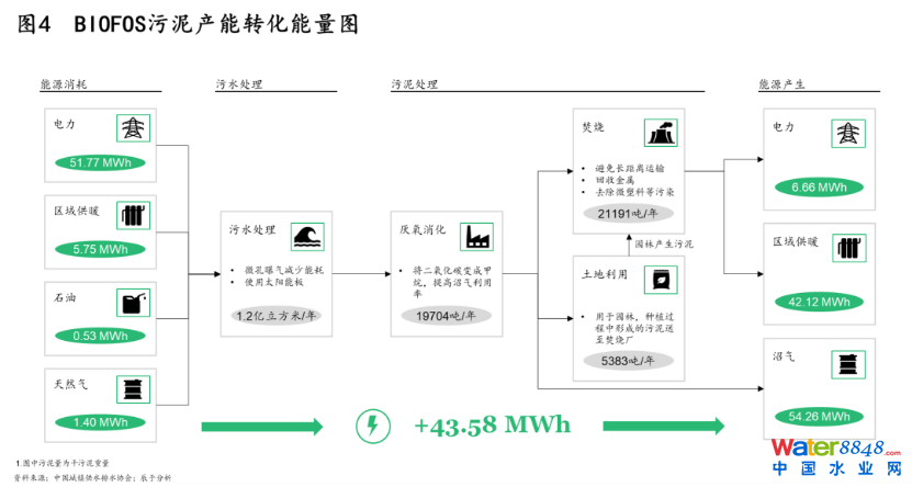其二,30·60雙碳目標(biāo)提出后,未來污泥處理處置將以節(jié)能降耗及能源資源回收為目標(biāo),這對污泥處理提出了更為清晰的技術(shù)路徑方向。例如在能源回收上,厭氧消化是優(yōu)選途徑,如丹麥污水廠BIOFOS通過污泥消化產(chǎn)能實現(xiàn)能量盈余(見圖4)。