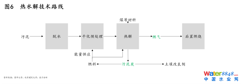而在資源回收上,相比好氧堆肥,干化焚燒及熱水解則是更好的資源化方式,值得重點(diǎn)關(guān)注。干化焚燒的技術(shù)路線如圖5所示,作為快捷、徹底實現(xiàn)污泥減量化、穩(wěn)定化、無害化的最終處置技術(shù),干化焚燒后的資源化利用產(chǎn)品也更易走通;熱水解的技術(shù)路線如圖6所示,其生產(chǎn)過程清潔化,生成的污泥炭資源多樣化。