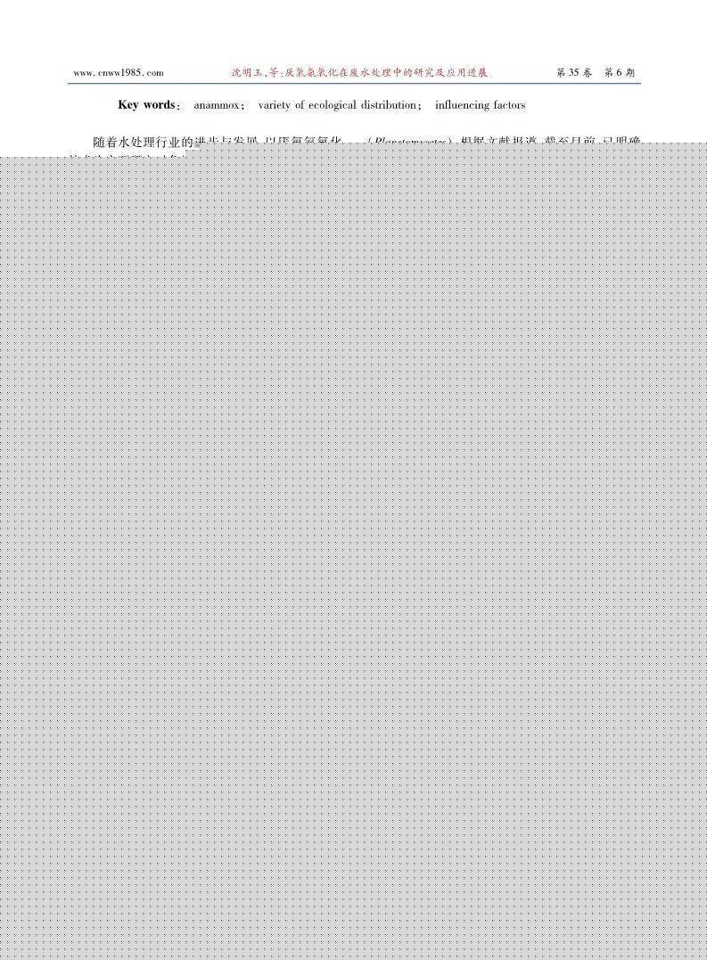 厭氧氨氧化在廢水處理中的研究及應(yīng)用 進(jìn)展 中國給水排水1000-406212-1073/TU] 卷:第35卷期數(shù):2019年06期頁碼:16-21欄目:出版日期:2019-03-17