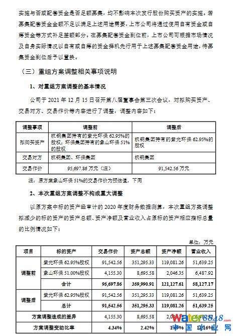 本次交易募集配套資金總額不超過8.22億元,不超過本次擬發(fā)行股份購買資產(chǎn)交易價格的100%。募集資金在扣除中介機構(gòu)費用及相關(guān)稅費后,擬用于投入桐廬縣分水鎮(zhèn)污水廠一二期清潔排放提標工程項目、桐廬縣分水鎮(zhèn)污水廠三期擴建工程項目、福清市元洪投資區(qū)污水處理廠一二期提標改造項目、青田縣金三角污水處理廠清潔排放改造工程項目、低碳生態(tài)環(huán)保設(shè)計研究院、浙江富春紫光環(huán)保股份有限公司智慧水務(wù)項目及補充上市公司流動資金。其中,補充上市公司流動資金的比例未超過募集配套資金總額的50%。