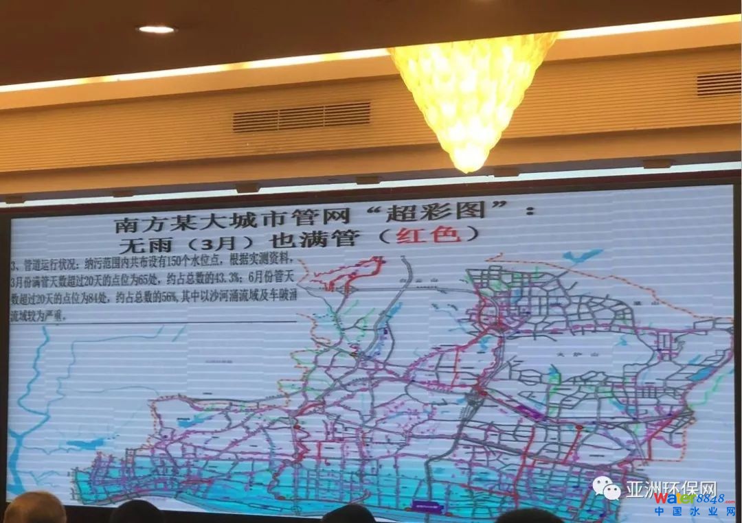 據(jù)他提供的南方某大城市管網(wǎng)運(yùn)行超彩圖顯示,納污范圍內(nèi)共布設(shè)有150個(gè)水位點(diǎn),在雨少季的3月份,滿管天數(shù)超過(guò)20天的點(diǎn)位為65處,約占總數(shù)的43.3%,而在6月份,滿管天數(shù)超過(guò)20天的點(diǎn)位數(shù)則更多,為84處,約占總數(shù)的56%。