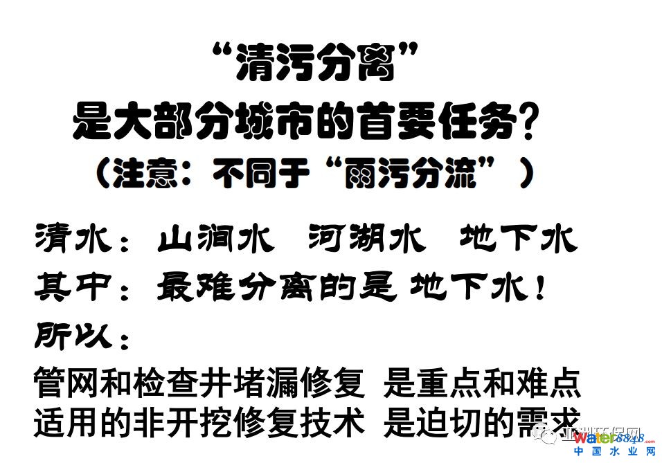 “清水包括山澗水、河湖水、地下水。檢測(cè)證明,大量是從管網(wǎng)漏進(jìn)來(lái)的。特別是地下水,量大面廣最難分離,因此,管網(wǎng)和檢查井堵漏修復(fù)是重點(diǎn)和難點(diǎn),對(duì)適用的非開挖修復(fù)技術(shù)需求迫切。”張悅表示,對(duì)于地下水必須真刀實(shí)槍下功夫。不能做躲了這一代,難題留給下一代的事兒。