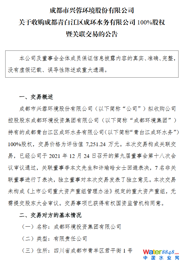 興蓉環(huán)境:擬以7251.24萬元收購青白江成環(huán)水務100%股權