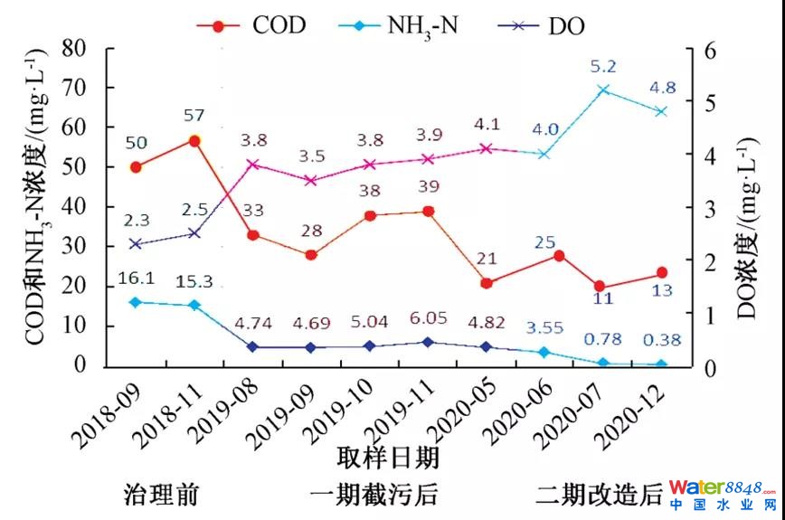 通過綜合治理判斷和工程技術(shù)應(yīng)用,暗涵在治理前和分期控源截污后,暗涵出口水質(zhì)明顯改善,水質(zhì)情況見圖4。下游水體透明度(大于50 cm)和ORP(均值約75)均值滿足消除黑臭水體標準,主要指標達到地表水Ⅳ類標準。因遠期源頭園區(qū)范圍內(nèi)部的混錯接、初雨污染及涵內(nèi)沉積底泥污染緩釋等原因,降雨過后暗涵出水水質(zhì)仍有輕微反彈現(xiàn)象。