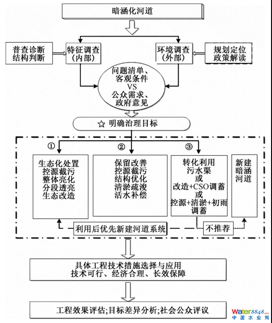 暗涵化河道治理是水環(huán)境綜合治理,特別是黑臭水體治理的關(guān)鍵“黑箱”部分,國內(nèi)外有很多暗涵治理實踐經(jīng)驗和教訓(xùn)。對于現(xiàn)狀暗涵化河道,需按照調(diào)查分析、明確目標、確定原則及工程應(yīng)用的系統(tǒng)治理思路進行最優(yōu)化處置,見圖2