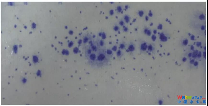 在單元測(cè)試之后,對(duì)膜樣片進(jìn)行龍膽紫染色試驗(yàn)。被機(jī)械損壞的薄膜會(huì)吸收這種染料,嚴(yán)重?fù)p壞區(qū)域,甚至?xí)谷?/span>-料滲入到背面。如圖7所示,膜的染料染色試驗(yàn)陽性,表明膜具有明顯損傷。