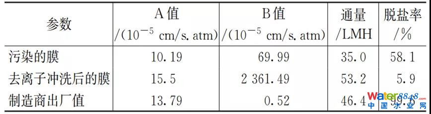 取膜切片,測(cè)定A”和“B”值。“A”值為水通道常數(shù),是滲透流量的函數(shù),A值越高,通過膜的流量就越好。“B”值為鹽通道常數(shù),是抗鹽性的函數(shù),B指數(shù)越高,滲透液中的鹽分越多。低A值和中高B值可能表示膜有污染,低A和高B>10)可能表示已經(jīng)水垢形成,非常高的A>50%的制造商出廠值)或B>500)可能表明膜降解或膜破損。測(cè)試所得的AB的值見表3,分析沖洗前數(shù)據(jù),A和通量都小于出廠值,說明膜有污堵;B值和脫鹽率均明顯劣于出廠值,膜可能存在破損現(xiàn)象;沖洗后,通量增大,B值劇增,脫鹽能力幾乎喪失,證明膜確實(shí)存在破損。