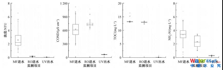 統(tǒng)計(jì)2019全年運(yùn)行雙膜系統(tǒng)進(jìn)水及雙膜系統(tǒng)凈化,經(jīng)紫外消毒后的出水指標(biāo),如圖3所示。微濾系統(tǒng)主要對(duì)濁度有明顯的去除效果,濁度從微濾系統(tǒng)進(jìn)水的(2.58±1.02) NTU降至出水平均值(0.17±0.03) NTU,去除率達(dá)到93.4%。微濾系統(tǒng)對(duì)總有機(jī)碳(TOC)無明顯去除作用。NH3-N通過微濾系統(tǒng)后有一定程度降低,從微濾系統(tǒng)進(jìn)水的(3.38±0.84) mg/L降至(2.33±0.77) mg/L