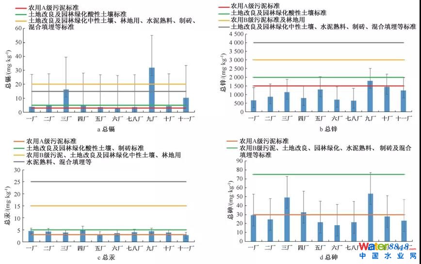 2017201910次檢測(20172次,20184次、20194次)昆明主城各城鎮(zhèn)污水處理廠鎘、鋅、汞、砷泥質(zhì)特征見圖1,不同污水處理廠泥質(zhì)有顯著區(qū)別,宜進(jìn)行分質(zhì)處理處置。其中第一、二、五、六、七(八)、十水質(zhì)凈化廠污泥泥質(zhì)最好,除農(nóng)用A級泥質(zhì)不滿足以外,其余處置途徑均適用;第四、十一水質(zhì)凈化廠污泥泥質(zhì)較好,除農(nóng)用A級、園林綠化(酸性土壤)、土地改良(酸性土壤)泥質(zhì)不滿足以外,其余處置途徑均適用;第三水質(zhì)凈化廠污泥除農(nóng)用A級、農(nóng)用B級、園林綠化(酸性土壤)、土地改良(酸性土壤)泥質(zhì)不滿足以外,其余處置途徑均適用;第九水質(zhì)凈化廠污泥可通過焚燒處置,或進(jìn)一步處理后水泥窯協(xié)同處置。