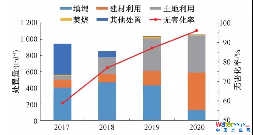 “水十條”提出“地級及以上城市污泥無害化處理處置率要求于2020年底前達(dá)到90%以上”的要求。參考《城鎮(zhèn)污水處理工作考核暫行辦法》附件中污泥處置的評分細(xì)則計(jì)算無害化率,即資源化利用(土地利用、建材利用)按100%、焚燒90%、達(dá)衛(wèi)生填埋標(biāo)準(zhǔn)填埋70%、其他處置(含應(yīng)急處置)30%。近年來(見圖2),昆明市污泥處理處置方式逐漸從填埋和應(yīng)急處置為主轉(zhuǎn)變?yōu)橥恋乩煤徒ú睦脼橹,污泥無害化處理處置率逐年提高,2020年無害處置率達(dá)95.94%,達(dá)到“水十條”目標(biāo)要求。