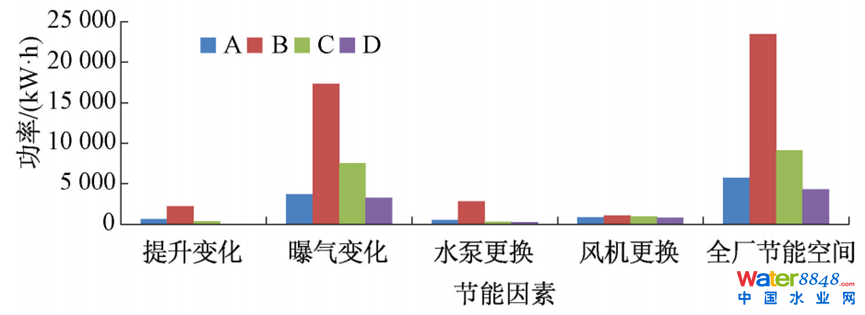 1)構建的節(jié)能粗評估方法,可初步計算各污水處理廠的節(jié)能空間,優(yōu)先找到節(jié)能空間較大的污水處理廠進行詳細診斷,例如文中的4座污水處理廠經過計算后,優(yōu)先對B廠進行詳細診斷。