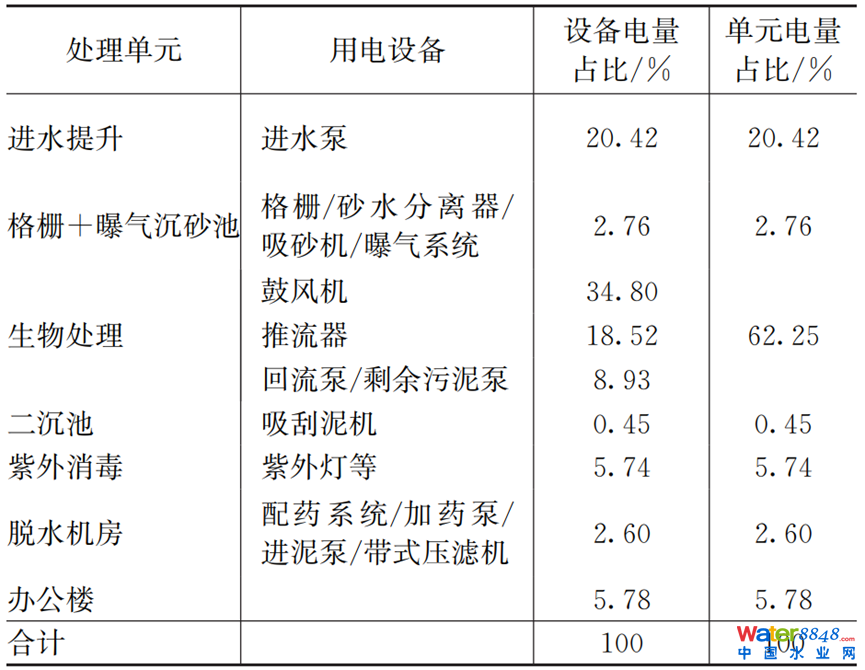 某座典型城市二級污水處理廠的電耗分布如表1所示。