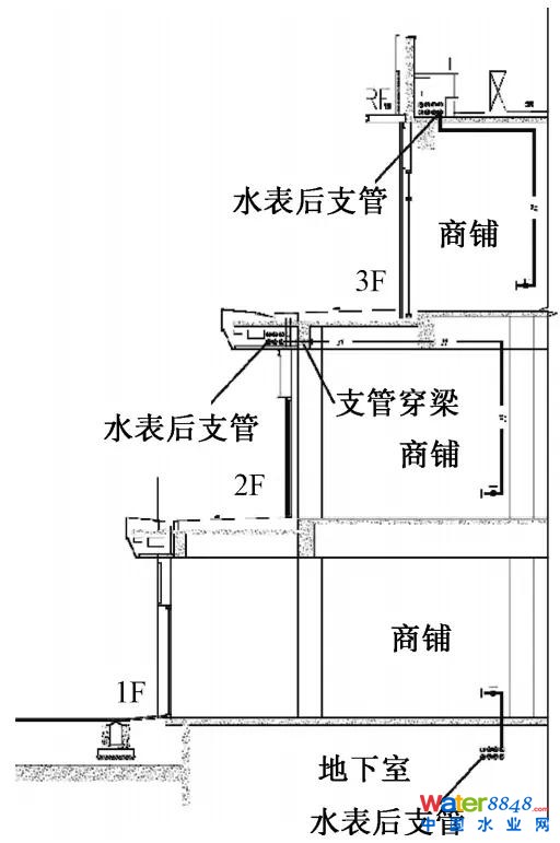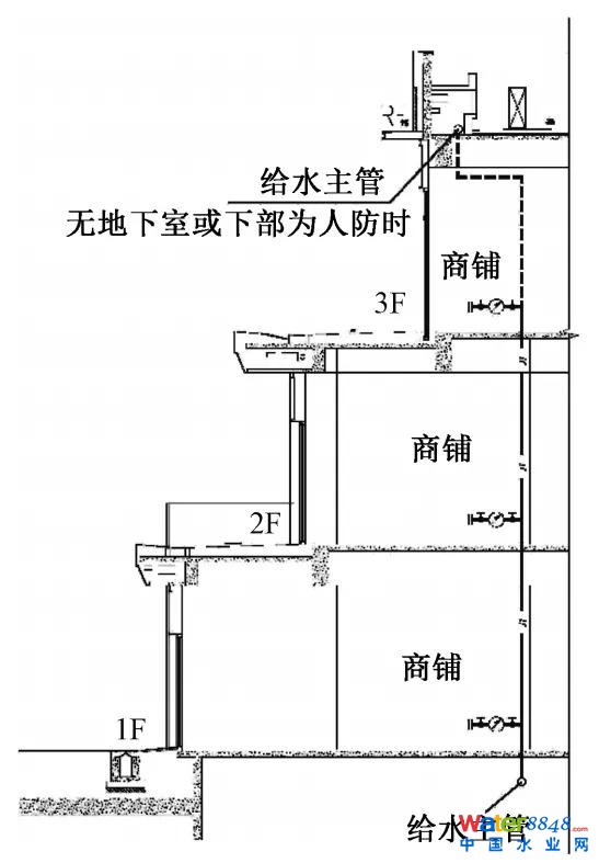 1)水表戶內(nèi)設(shè)置。此種方案將水表設(shè)置在鋪內(nèi),低位安裝,水表應(yīng)采用遠(yuǎn)傳型或插卡型以方便抄表。有地下室時(shí)可將給水干管設(shè)置于地下室,通過分立管形式入戶;無地下室或下部為人防時(shí)可在屋頂設(shè)置機(jī)電管廊,給水干管設(shè)置于管廊內(nèi),支管下穿屋面入戶,給水管置于屋面時(shí)需根據(jù)當(dāng)?shù)貧夂蛱卣鞑扇∮行У姆纼霰卮胧,?yán)寒或寒冷地區(qū)干管可設(shè)置于頂層商鋪內(nèi)。此方案典型設(shè)計(jì)如圖1所示。
