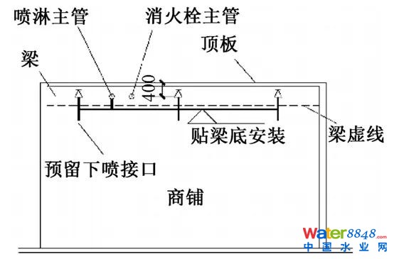 商業(yè)公區(qū)精裝修區(qū)域應(yīng)考慮設(shè)置吊頂型噴頭,其余應(yīng)設(shè)置直立型噴頭。商鋪多數(shù)為毛坯交付,應(yīng)設(shè)置直立型噴頭,但考慮到小業(yè)主二次裝修消防改造的便利性,可在直立型噴頭下方預(yù)留下噴接口。商鋪內(nèi)噴頭典型安裝方式如圖5所示。