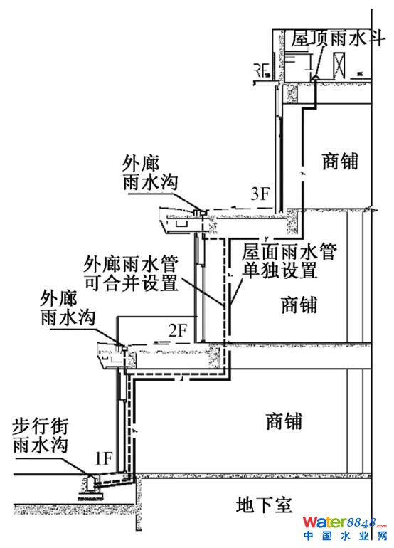 室外商業(yè)步行街雨水排水及其復(fù)雜,屋頂、各層的外廊、1層內(nèi)街均需要考慮雨水排水。有相當(dāng)一部分設(shè)計(jì)院在設(shè)計(jì)此類商業(yè)時(shí)將雨水分段散排至下層屋面,如此設(shè)計(jì)確實(shí)簡(jiǎn)便,但給今后商業(yè)的運(yùn)營(yíng)安全帶來諸多隱患。