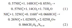 。1)有氧條件下,約一半的氨氮轉(zhuǎn)化為NO2--N的部分硝化(partialnitritation,PN)反應(yīng)階段,反應(yīng)方程式如式(1);