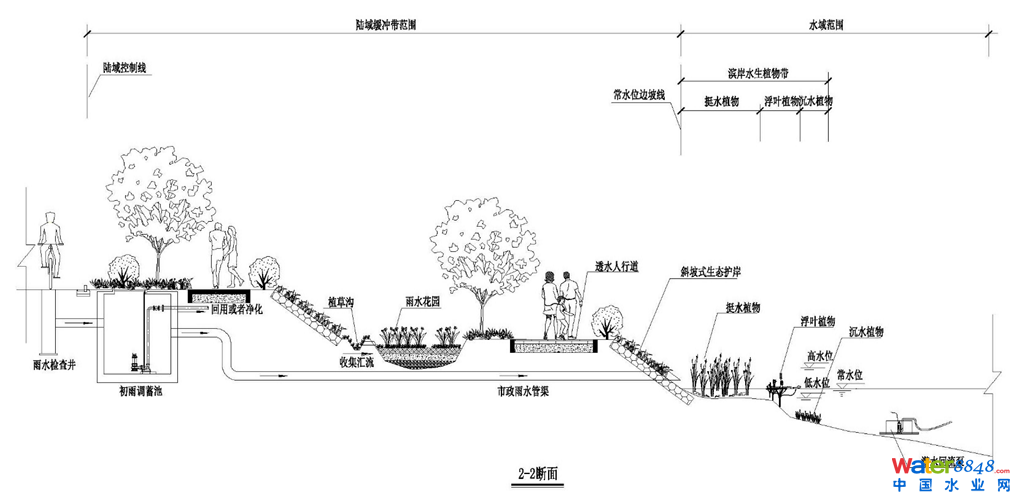 (5)針對深圳雨源性河流的特征,對進入河道不同來源及不同入流方式的雨水,提出場地地表徑流、雨水管渠內市政客水兩種不同的水質處理方式。地表徑流主要由雨水花園等低影響開發(fā)設施多重凈化后進入河道;市政客水初期雨水可經初雨調蓄池儲存與凈化,中后期雨水通過市政雨水管渠直接排入河道。