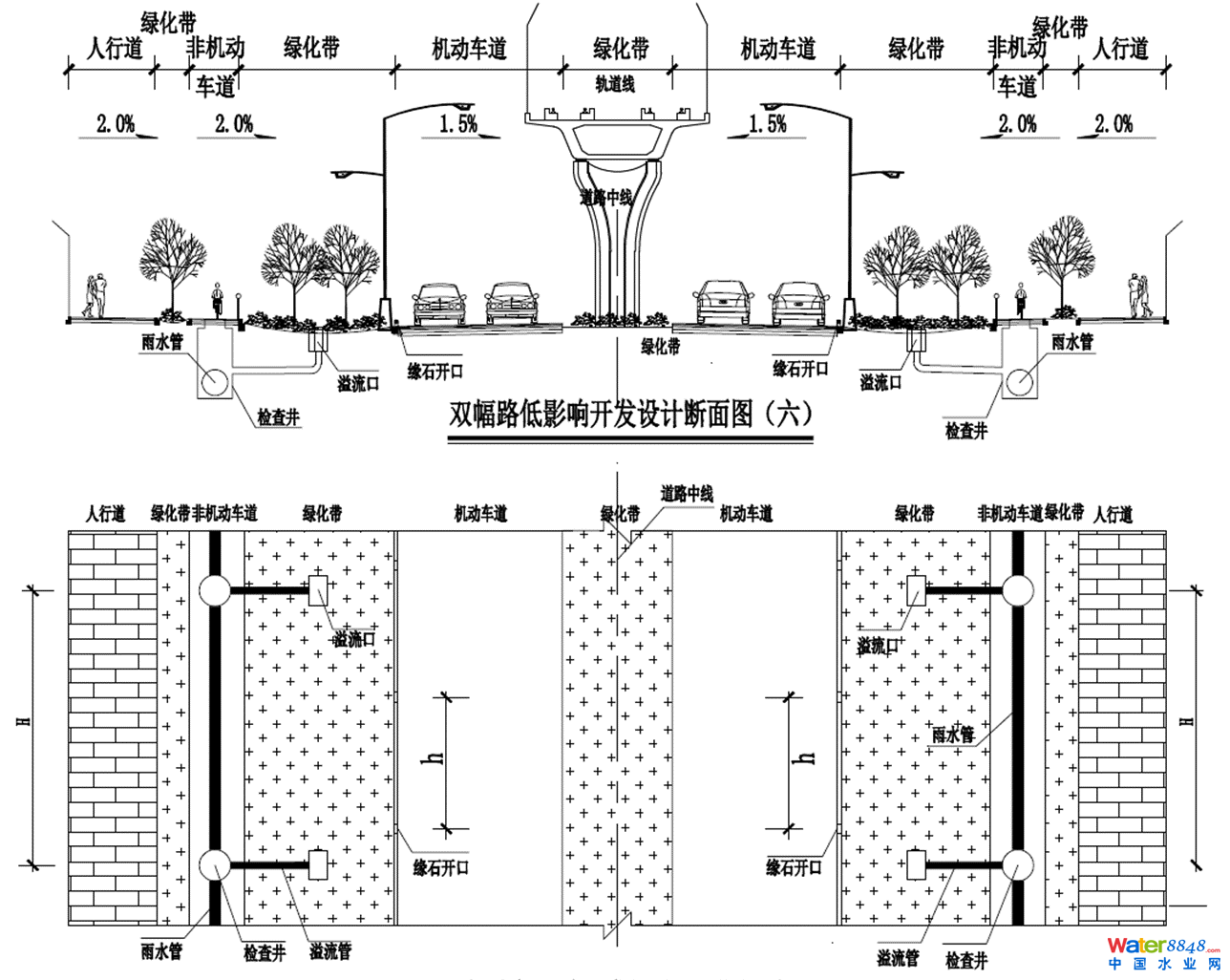 (3)針對用地緊張且分布占比較多的高架道路、軌道線路高架路面雨水徑流控制、橋下空間利用,新增了海綿城市建設解決方案,即高架路面雨水匯流至綠化帶,當水位高于溢流口頂面標高時溢流進入下游管道系統(tǒng)排走。